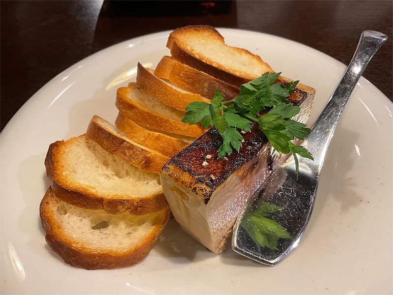 1番人気は、今回のイベントメニューにもなっている「鶏白レバーのパテ」(680円)メレンゲ状になったレバーパテ。上に掛かったカラメルソース。ムースケーキの様な見た目に驚くはずだ添えてあるバゲットにパテを塗って食べる臭みは全くないそれなのにレバーの良い風味だけが口の中に広がる。