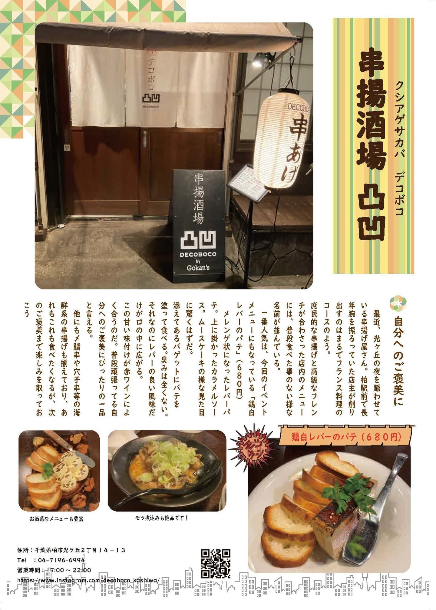 柏駅前で長年腕を振るっていた店主が創り出すのはまるでフランス料理のコースのよう庶民的な串揚げと高級なフレンチが合わさった店内のメニューには普段食べた事のない様な名前が並んでいる。