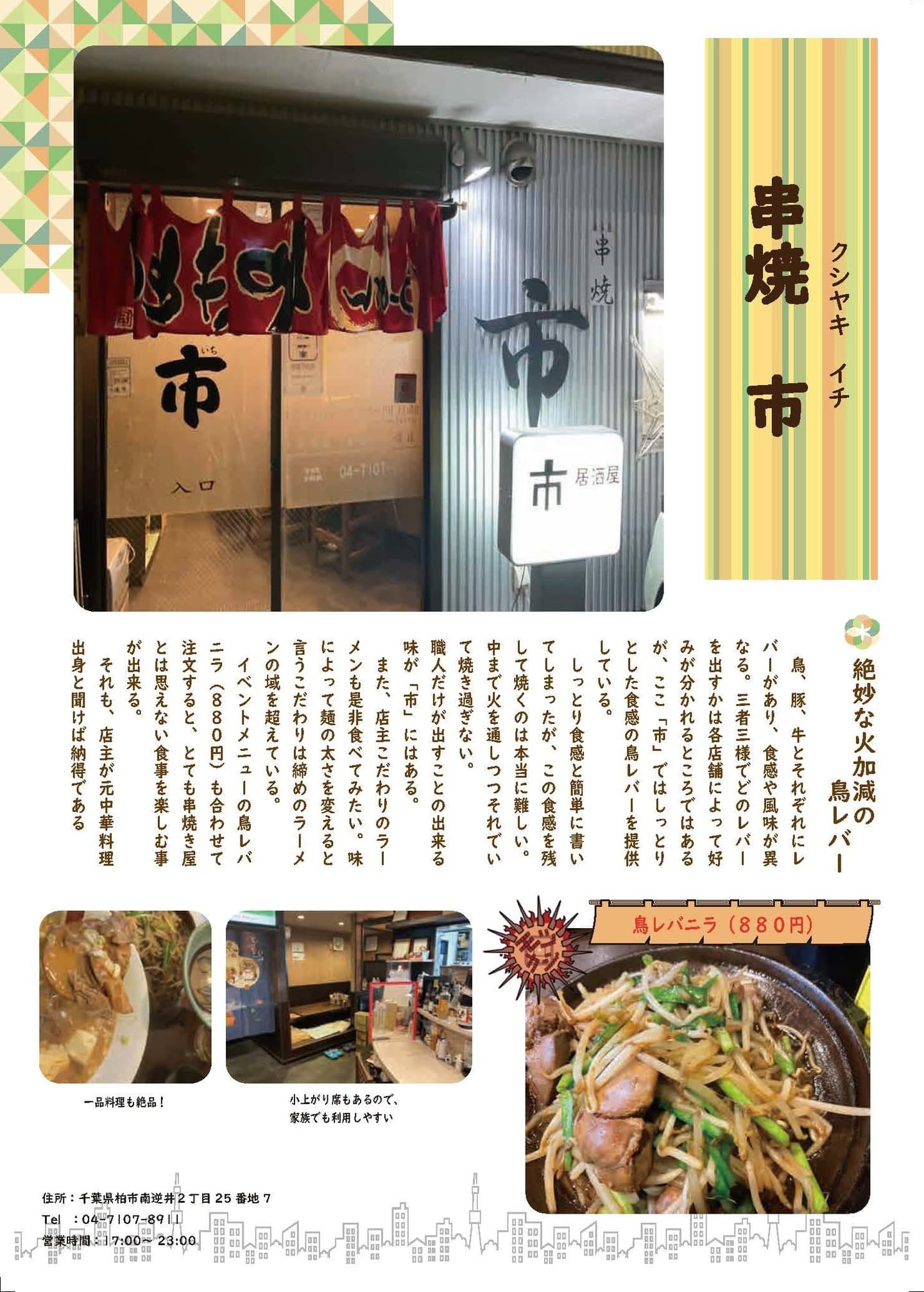 鳥、豚、牛とそれぞれにレバーがあり、食感や風味が異なる三者三様でどのレバーを出すかは各店舗によって好みが分かれるところではあるが、ここ「市」ではしっとりとした食感の鳥レバーを提供しているしっとり食感と簡単に書いてしまったが、この食感を残して焼くのは本当に難しい中まで火を通しつつそれでいて焼き過ぎない職人だけが出すことの出来る味が「市」にはあるまた、店主こだわりのラーメンも是非食べてみたい味によって麺の太さを変えると言うこだわりは締めのラーメンの域を超えているイベントメニューの鳥レバニラ(880円)も合わせて注文すると、とても串焼き屋とは思えない食事を楽しむ事が出来るそれも、店主が元中華料理出身と聞けば納得である。