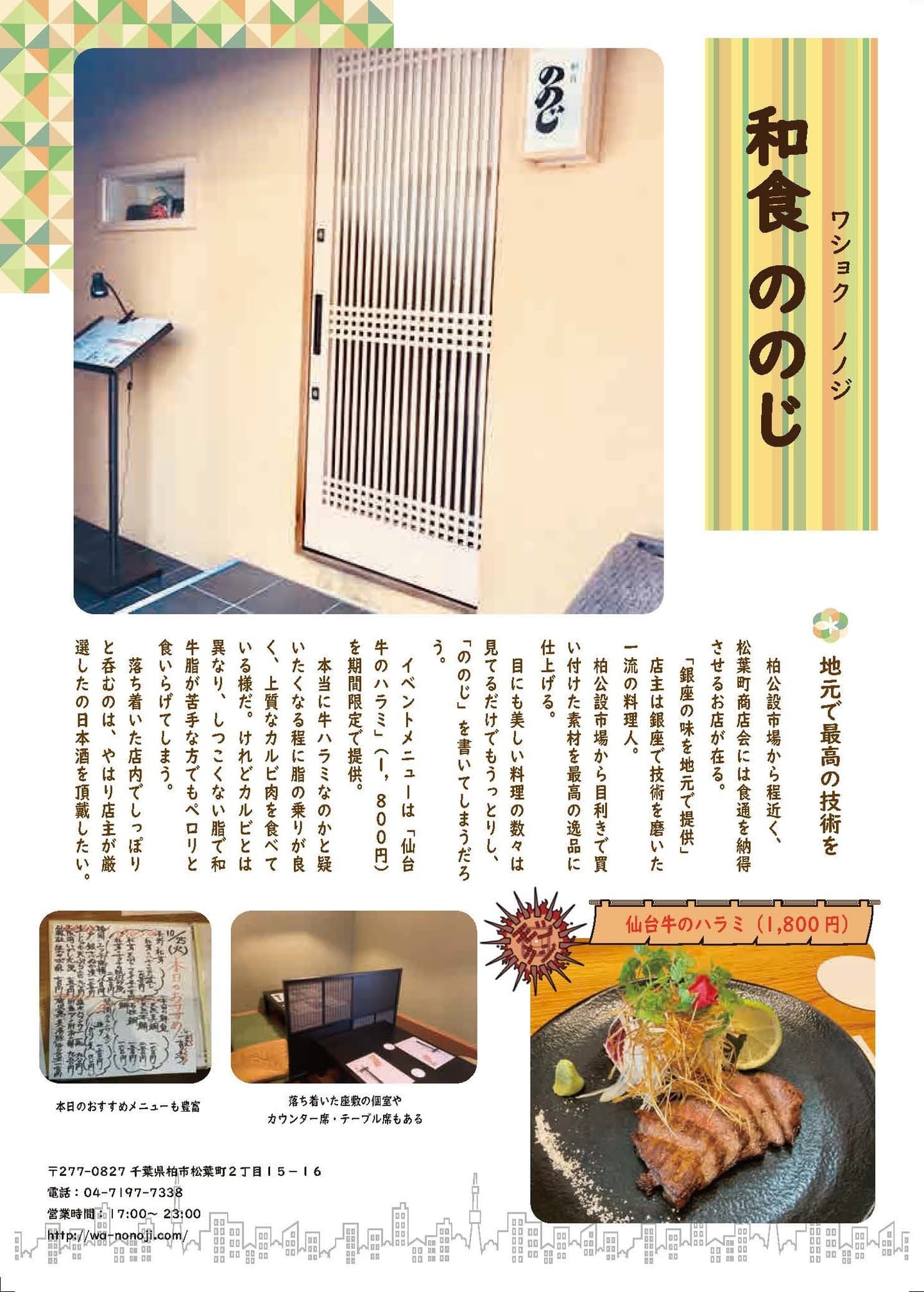 柏公設市場から程近く松葉町商店会には食通を納得させるお店が在る「銀座の味を地元で提供」店主は銀座で技術を磨いた一流の料理人柏公設市場から目利きで買い付けた素材を最高の逸品に仕上げる目にも美しい料理の数々は見てるだけでもうっとりし「ののじ」を書いてしまうだろうイベントメニューは「仙台牛のハラミ」(1800円)を期間限定で提供本当に牛ハラミなのかと疑いたくなる程に脂の乗りが良く、上質なカルビ肉を食べている様だけれどカルビとは異なり、しつこくない脂で和牛脂が苦手な方でもペロリと食いらげてしまう落ち着いた店内でしっぽりと呑むのは、やはり店主が厳選したの日本酒を頂戴したい。