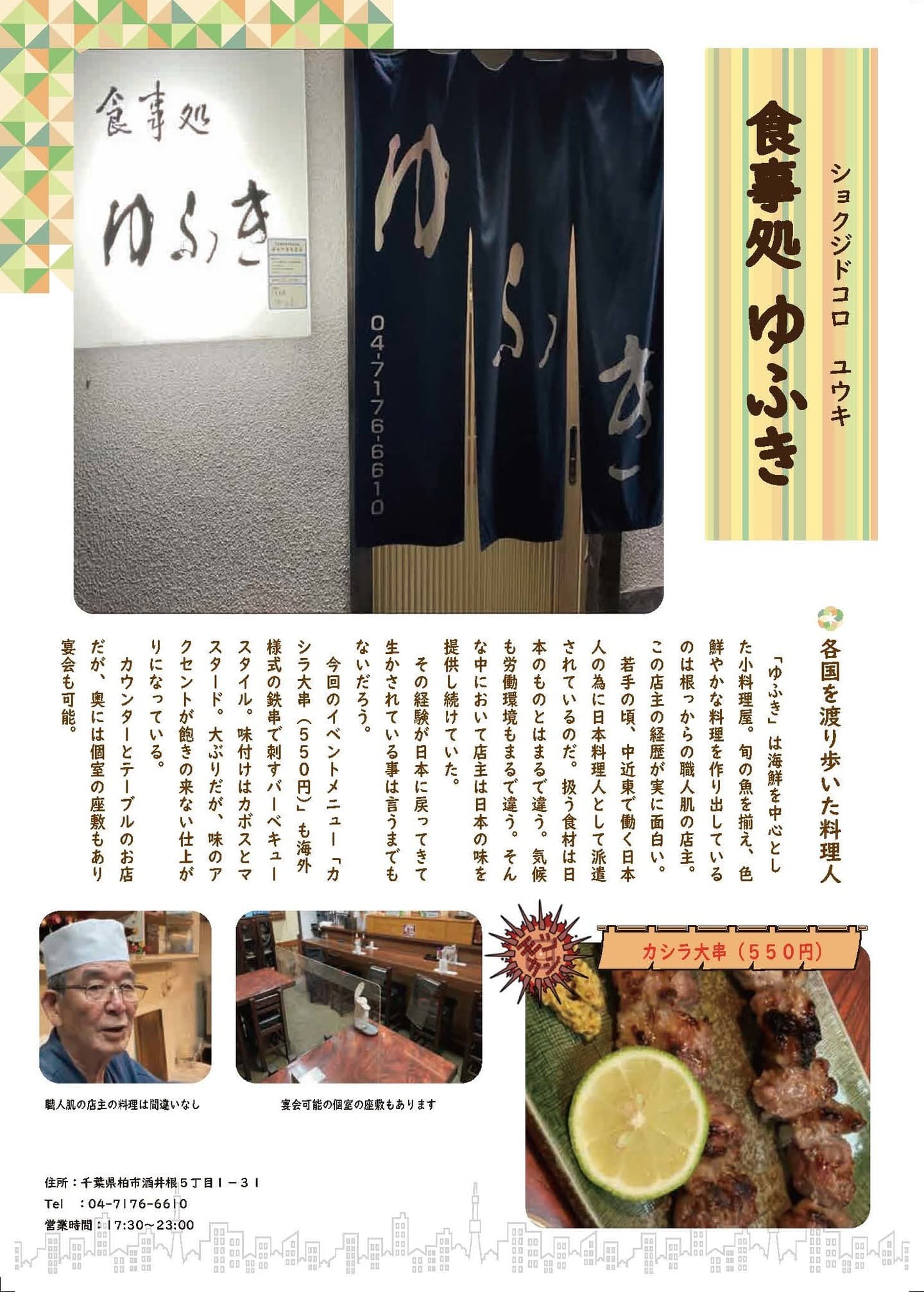 海鮮を中心とした小料理屋「ゆふき」旬の魚を揃え、色鮮やかな料理を提供している根っからの職人肌の店主この経歴が実に面白い若手の頃、中近東で働く日本人の為に日本料理人として派遣されているのだ扱う食材は日本のものとはまるで違う気候も労働環境もまるで違うそんな中において店主は日本の味を提供し続けていたその経験が日本に戻ってきて生かされている事は言うまでもないだろう。